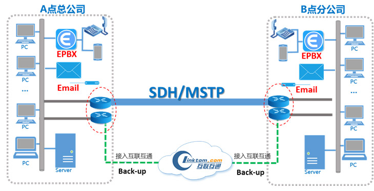 互联互通SDH专网产品是一种基于时分复用同步数字技术建立的透明物理通道,是基于SDH/MSTP专网,利用传统电路接入方式,为用户提供 的点到点透明链路网络服务。该产品利用时分复用技术,为每个用户分配单独的时隙,提供端到端的安全性保证。另外利用SDH环保护技术, 可有效保证用户网络的可靠性,将网络中断的风险降到更低。