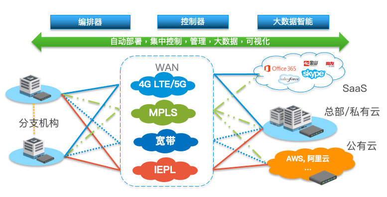 北京互联互通企业组网方案适合与大中型企业和运营商。北京互联互通通过部署企业专属的中心控制和大数据平台,可以对大型企业的多个放公司,分部门网络进行集中编排和管控。企业的总部,数据中心和分支机构可以有不同的拓扑结构。该组网方式也支持,移动办公人员,可通过安装客户端软件实现接入。北京互联互通支持各种CPE 设备形态,对小型分支,大型分支,数据中心有相应设备支持, 设备也可以以虚拟方式进行云端部署,支持AWS, AZURE,Google Cloud,阿里云,腾讯云, 天翼云,京东云等等公有云,以及KVM,VMWare, Openstack等私有部署。方案也支持多种类型链路( SD-WAN / MPLS / 互联网 / 4G / 卫星等 )同时接入。