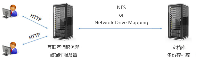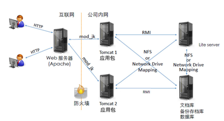 将应用服务器、数据库服务器、文档库服务器分开部署,有效保证中度并发正常访问系统,并设立待机服务器,以备主服务器宕机情况时使用。